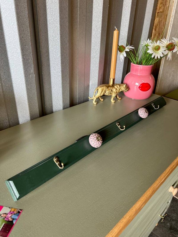 Kapstok in manor green met haakjes & roze/groene knoppen