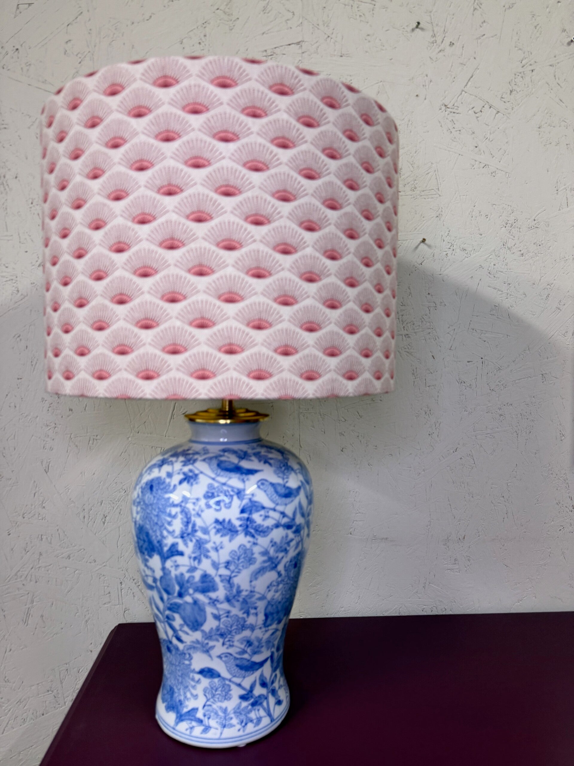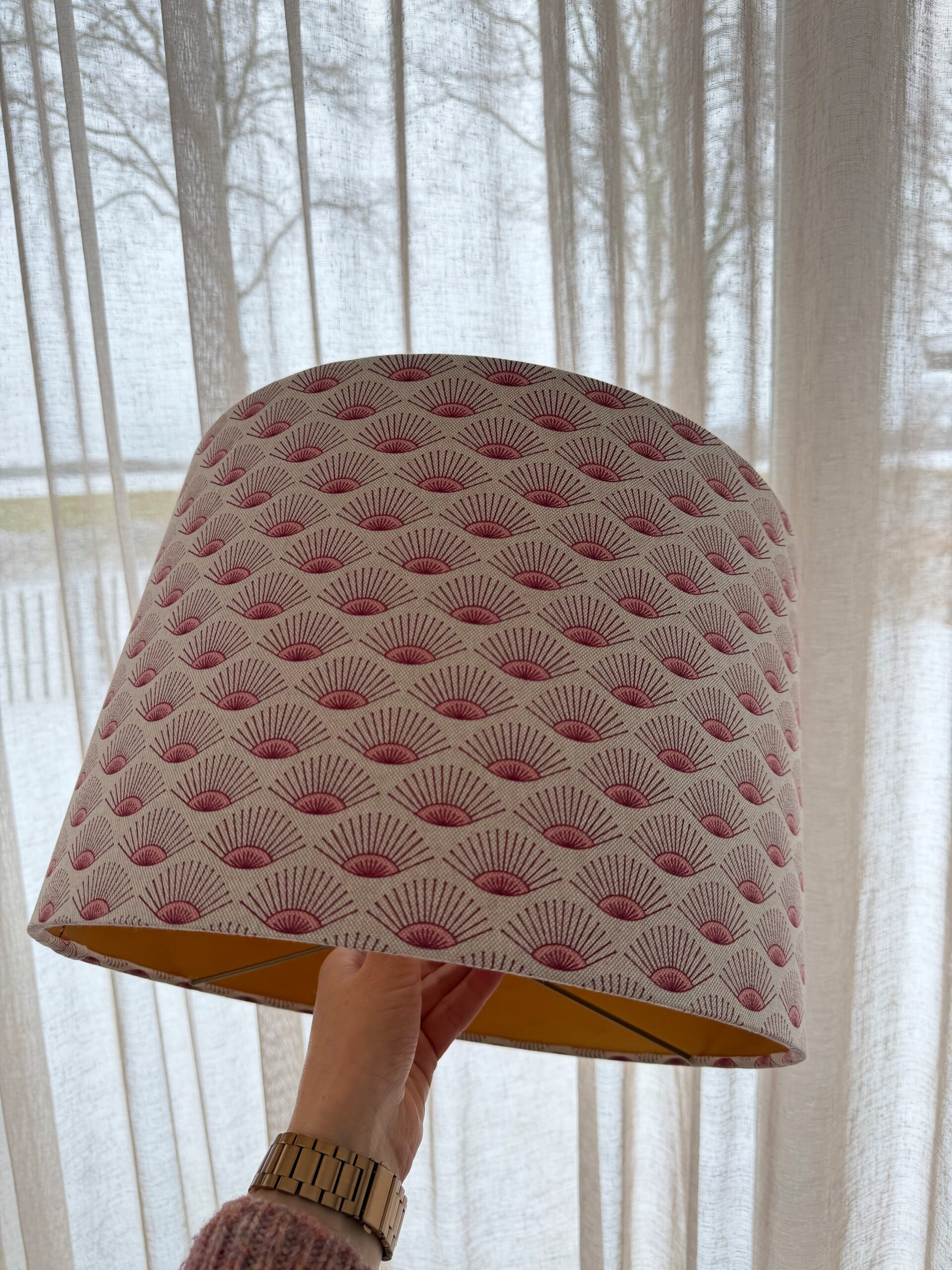 De lampenkap heb ik gemaakt van een mooie linnen look stof die creme/beige met roze is. Aan de binnenzijde heeft de kap een mat gouden lampenkapfolie.
