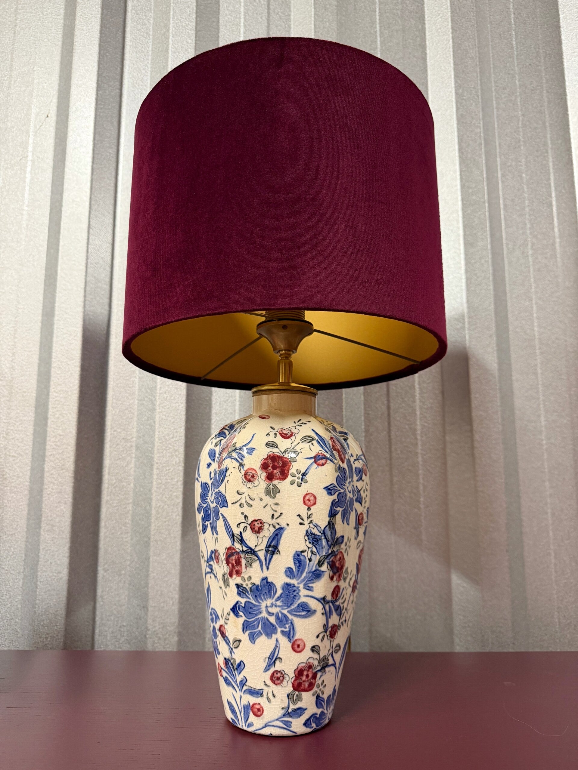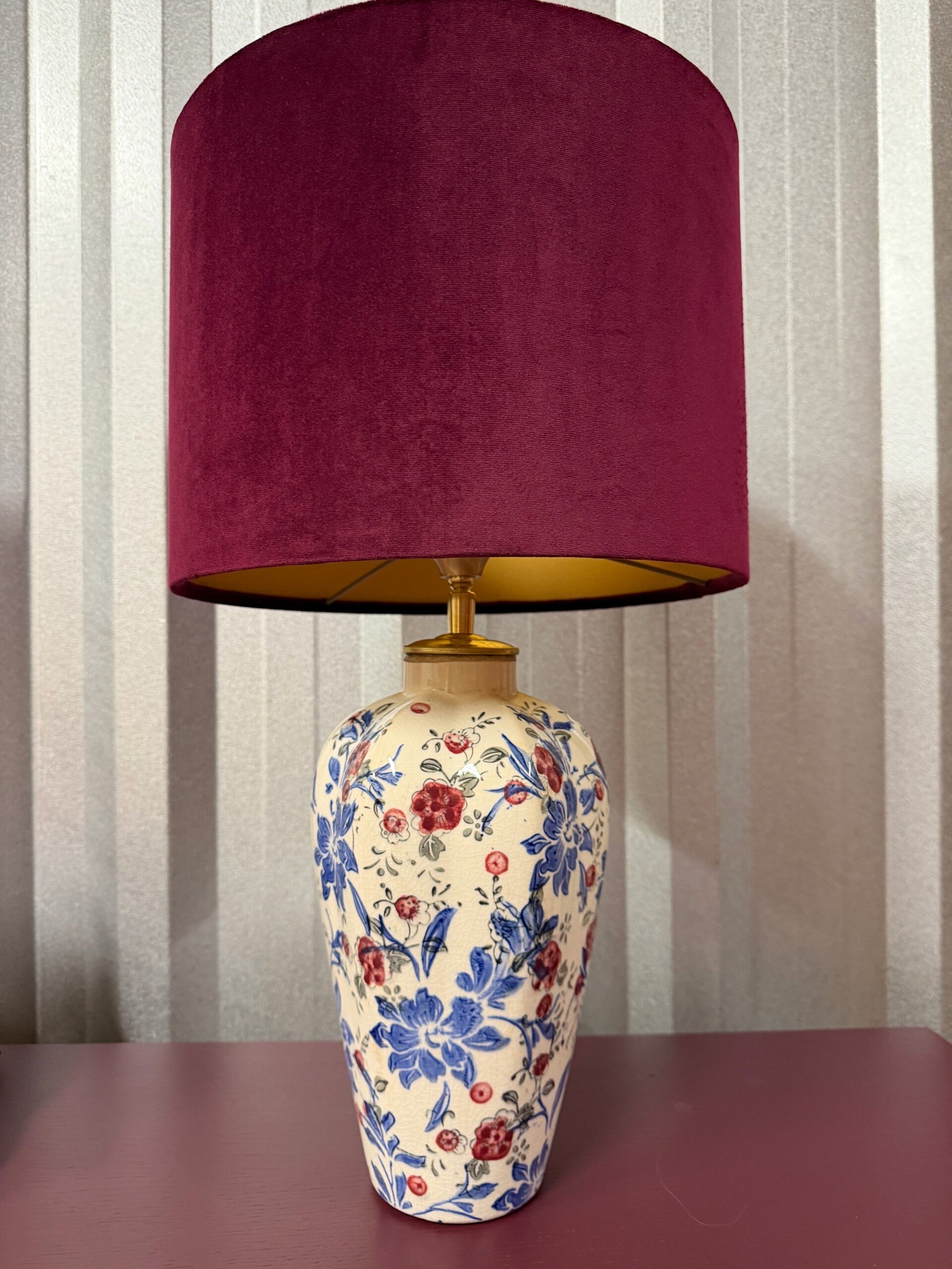 De lampenkap heeft een diameter van 30 cm en is 22 cm hoog en is gemaakt van een velvet aubergine kleurige stof.