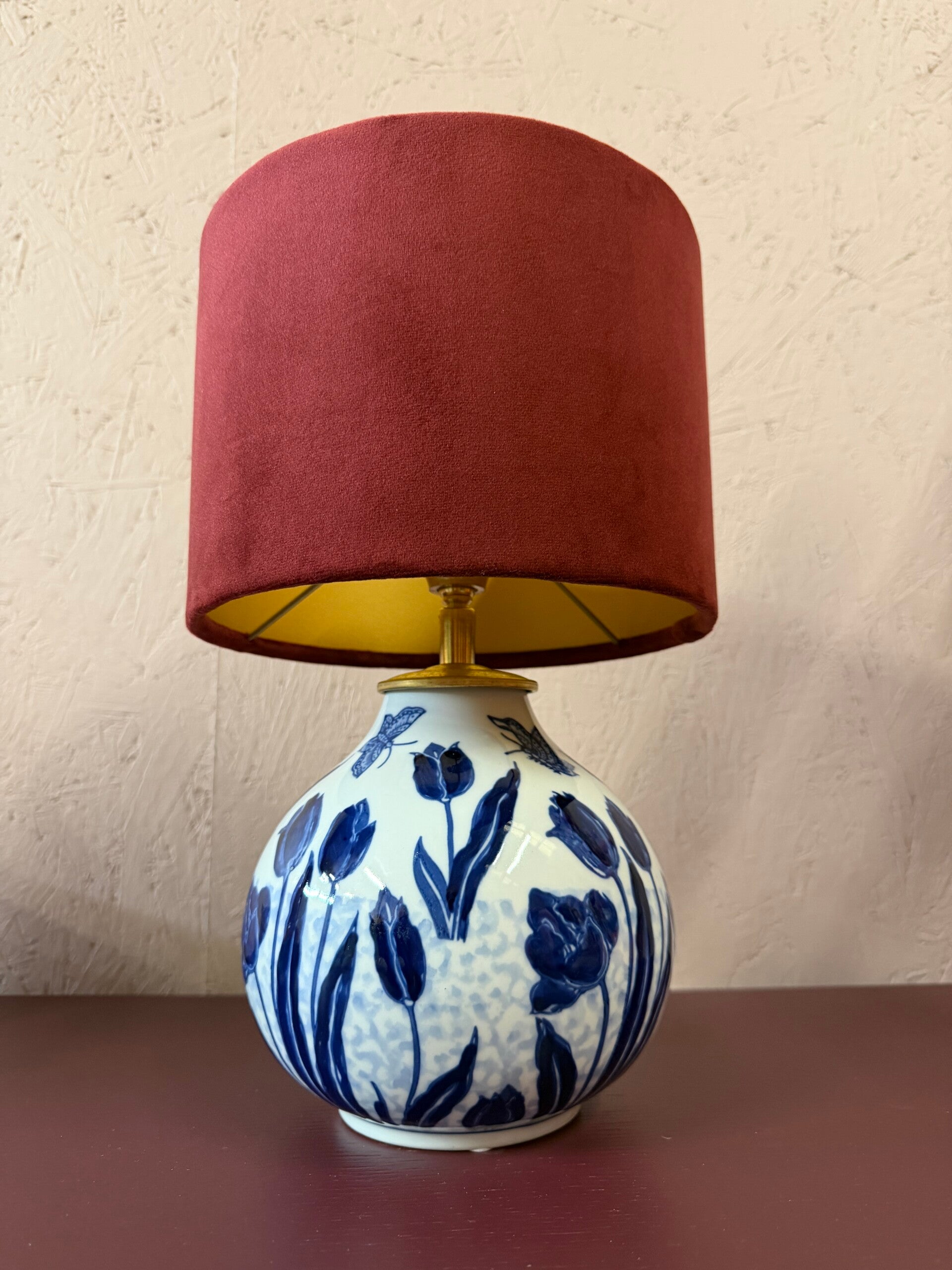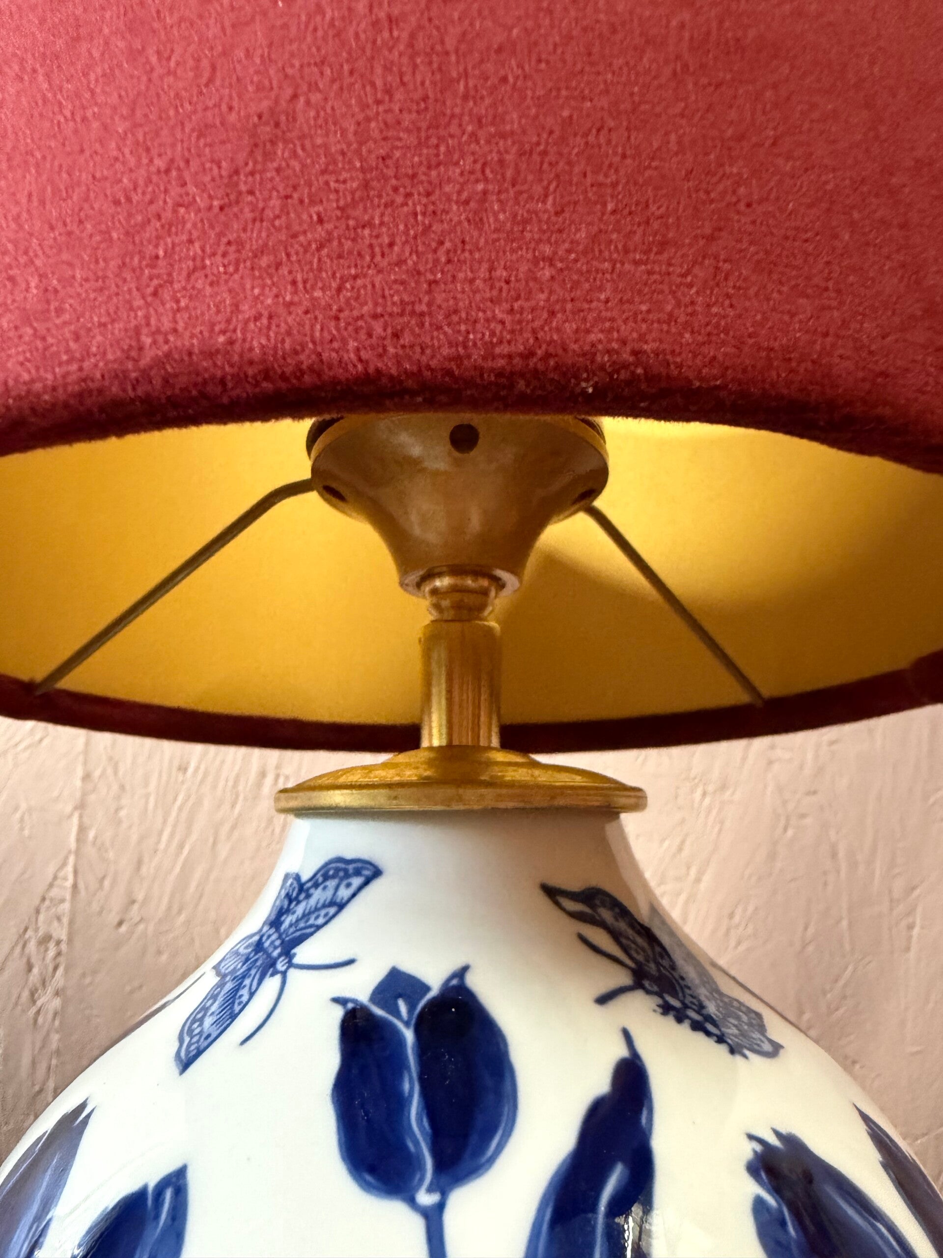 De kap is gemaakt van wijnrode velvet stof met een mat goude binnenkant.