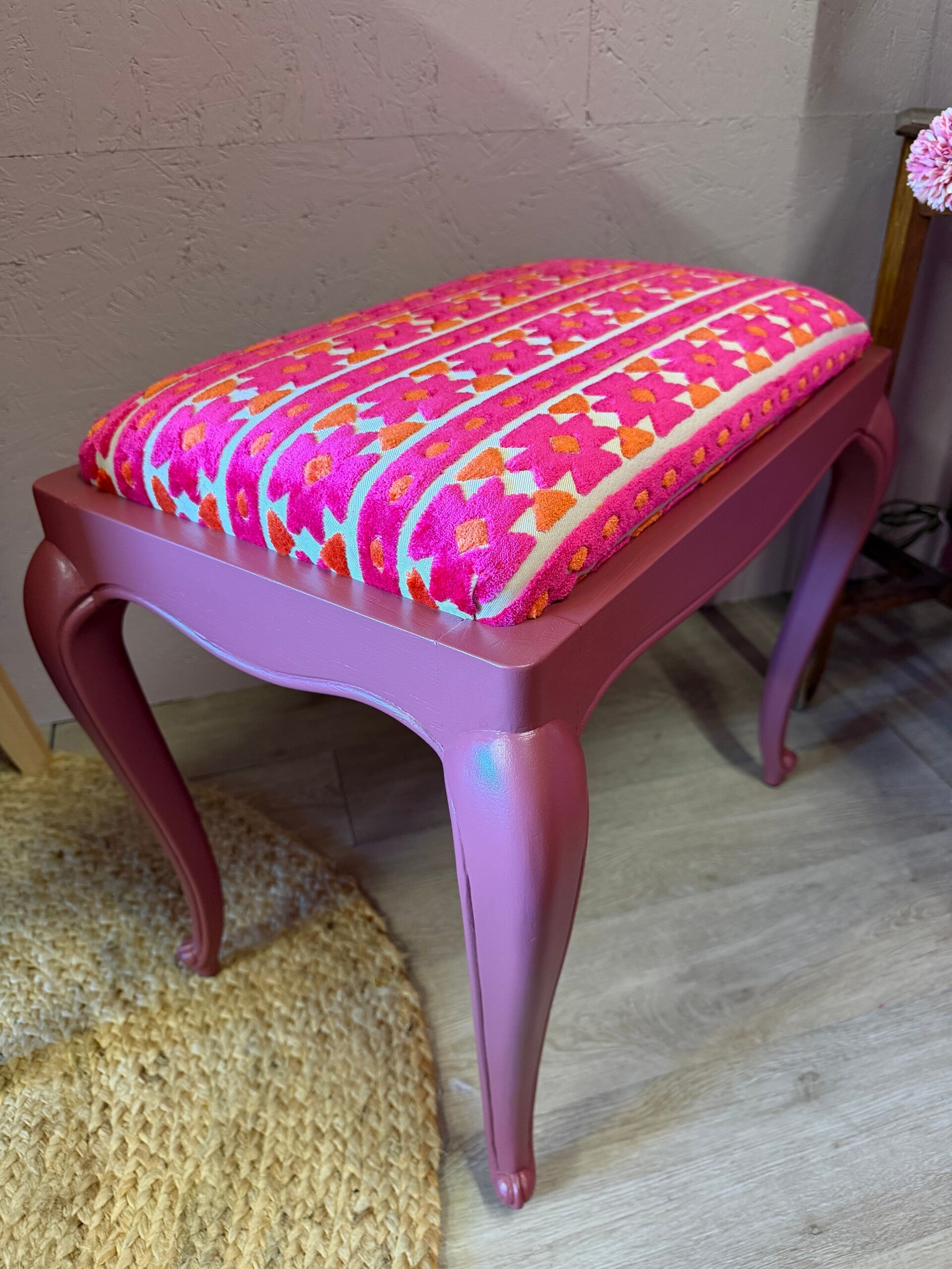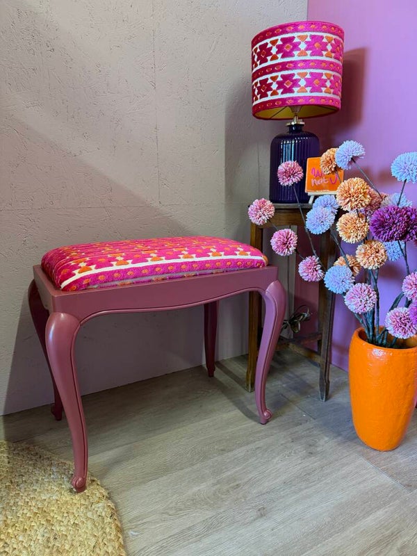 Deze kruk is geverfd in de kleur Rosewood van Wise Owl, heeft een nieuwe vulling gekregen en heb ik gestoffeerd met de stof Bazaar begonia van het merk Iliv. De onderkant is afgewerkt met oranje stof.